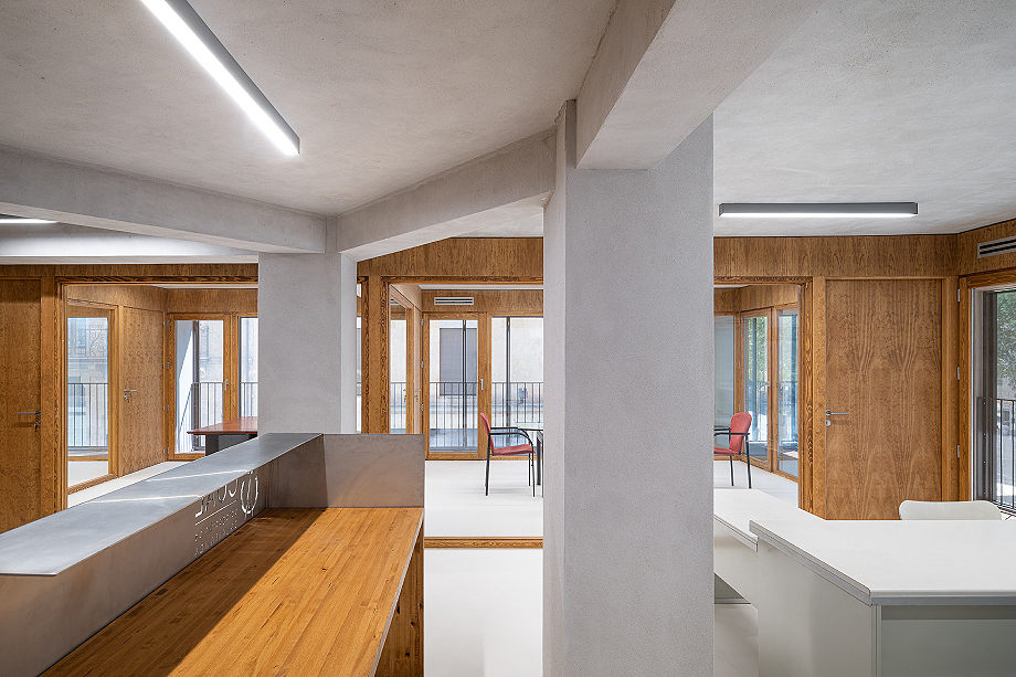Para conseguir una imagen sobria y homogénea, los arquitectos optaron por una paleta de materiales y sistemas limitada. Se aplicó un mortero de corcho sobre los techos y la estructura de hormigón, lo que permitió mejorar el acondicionamiento acústico minimizando los espesores. El pavimento se resolvió mediante un suelo continuo con acabado epoxy. Las carpinterías y los tableros son de pino natural tintado, mientras que los espacios del núcleo de servicios se revistieron con un azulejo en tono verde, similar al que ya existía. Por su parte, las contraventanas metálicas de la fachada se lacan en negro e incorporan la rotulación de la Delegación mediante perforaciones.