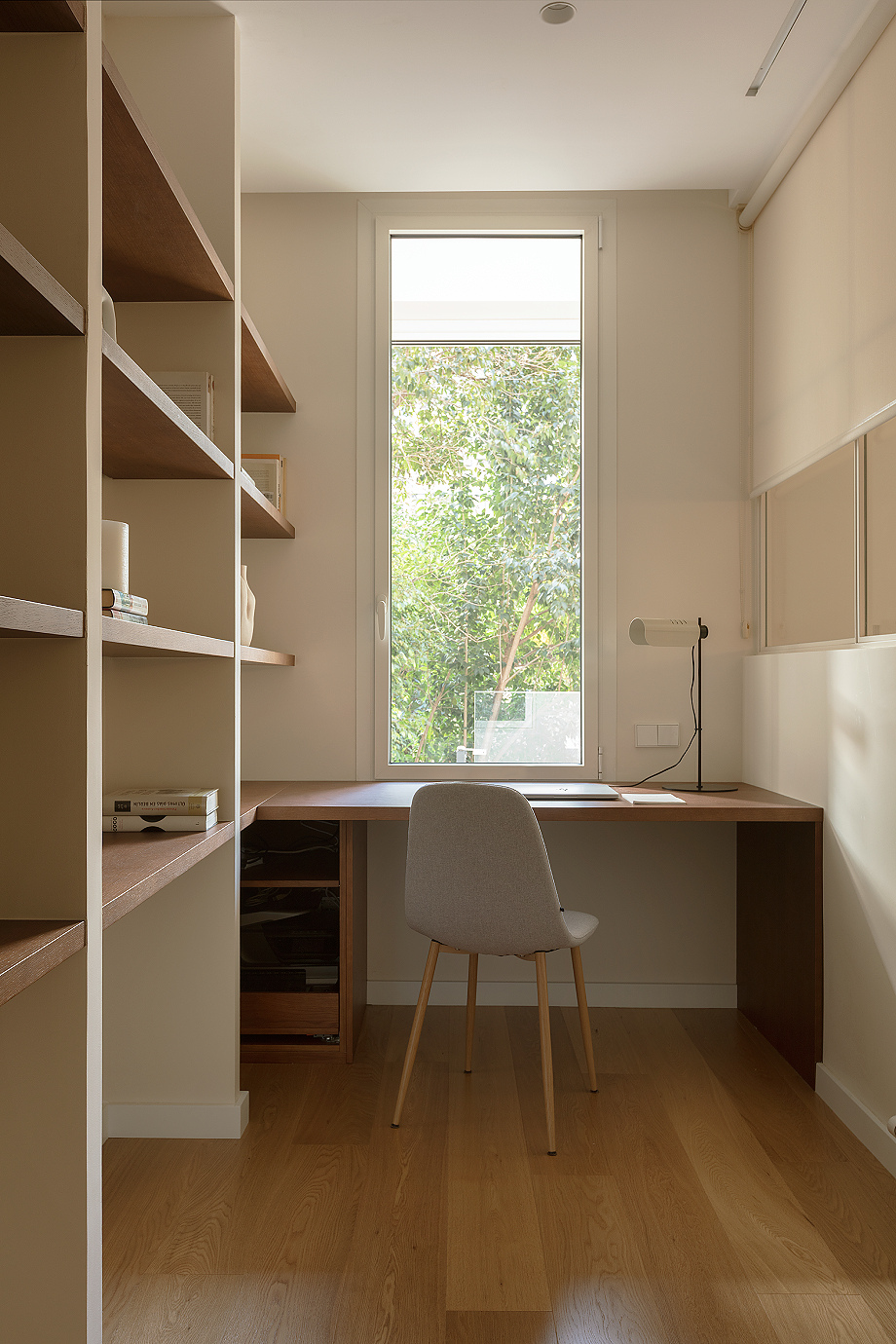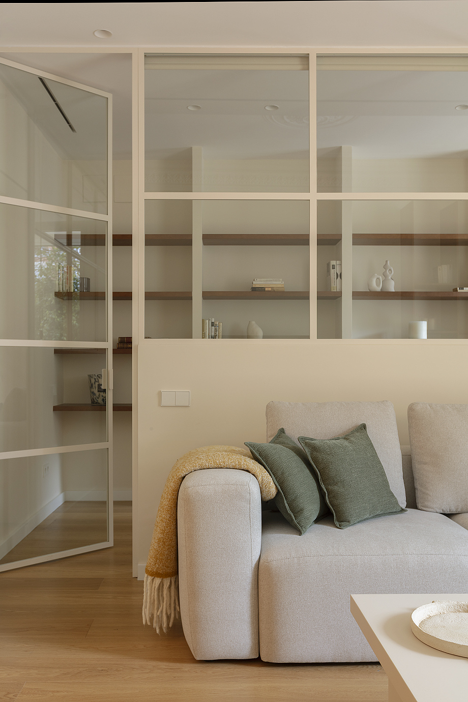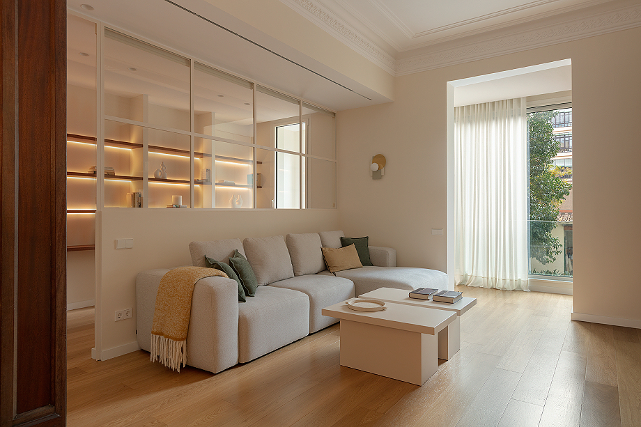 El acceso al piso se realiza a través de un generoso recibidor que actúa como transición entre la zona de día, ubicada a mano derecha, y la zona de noche, organizada a mano izquierda. La cocina, abierta al comedor y al salón, se integró de forma contemporánea y cálida, aprovechando la profundidad del piso para generar gran sensación de amplitud. Por su parte, la pared trasera de la sala de estar se convirtió en uno de los puntos más destacados del proyecto, con una cristalera que permite entrever el despacho y una estantería a medida que recorre el espacio de lado a lado, aportando carácter y diseño.