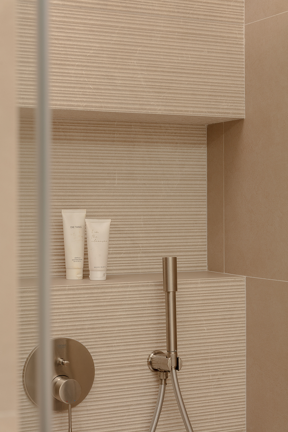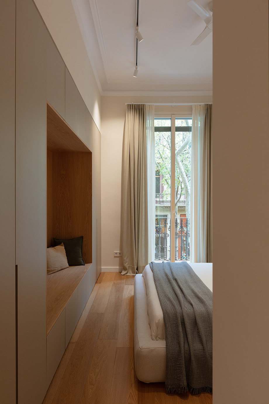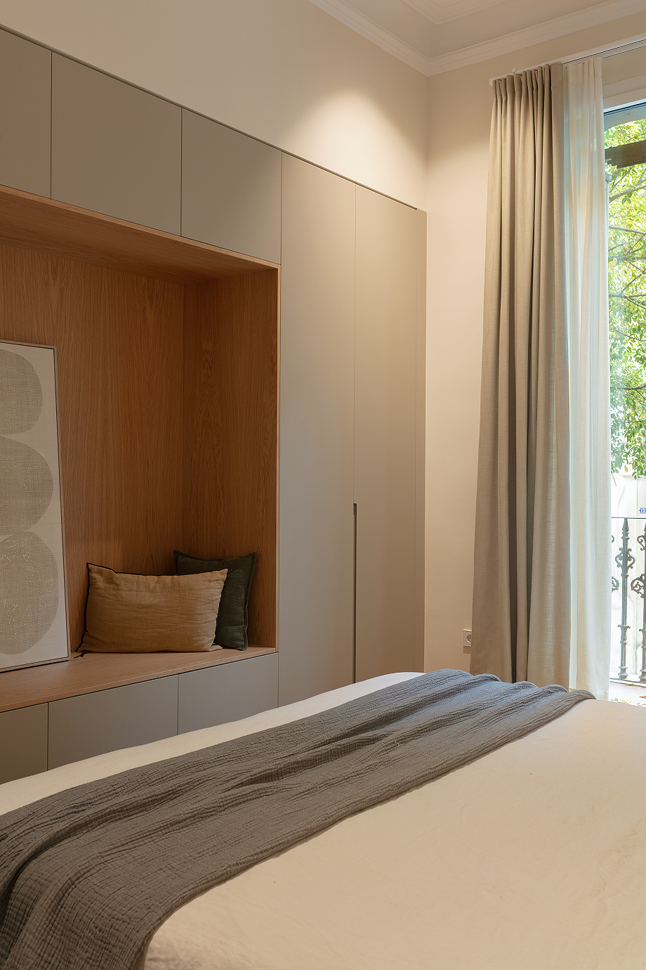 El acceso al piso se realiza a través de un generoso recibidor que actúa como transición entre la zona de día, ubicada a mano derecha, y la zona de noche, organizada a mano izquierda. La cocina, abierta al comedor y al salón, se integró de forma contemporánea y cálida, aprovechando la profundidad del piso para generar gran sensación de amplitud. Por su parte, la pared trasera de la sala de estar se convirtió en uno de los puntos más destacados del proyecto, con una cristalera que permite entrever el despacho y una estantería a medida que recorre el espacio de lado a lado, aportando carácter y diseño.