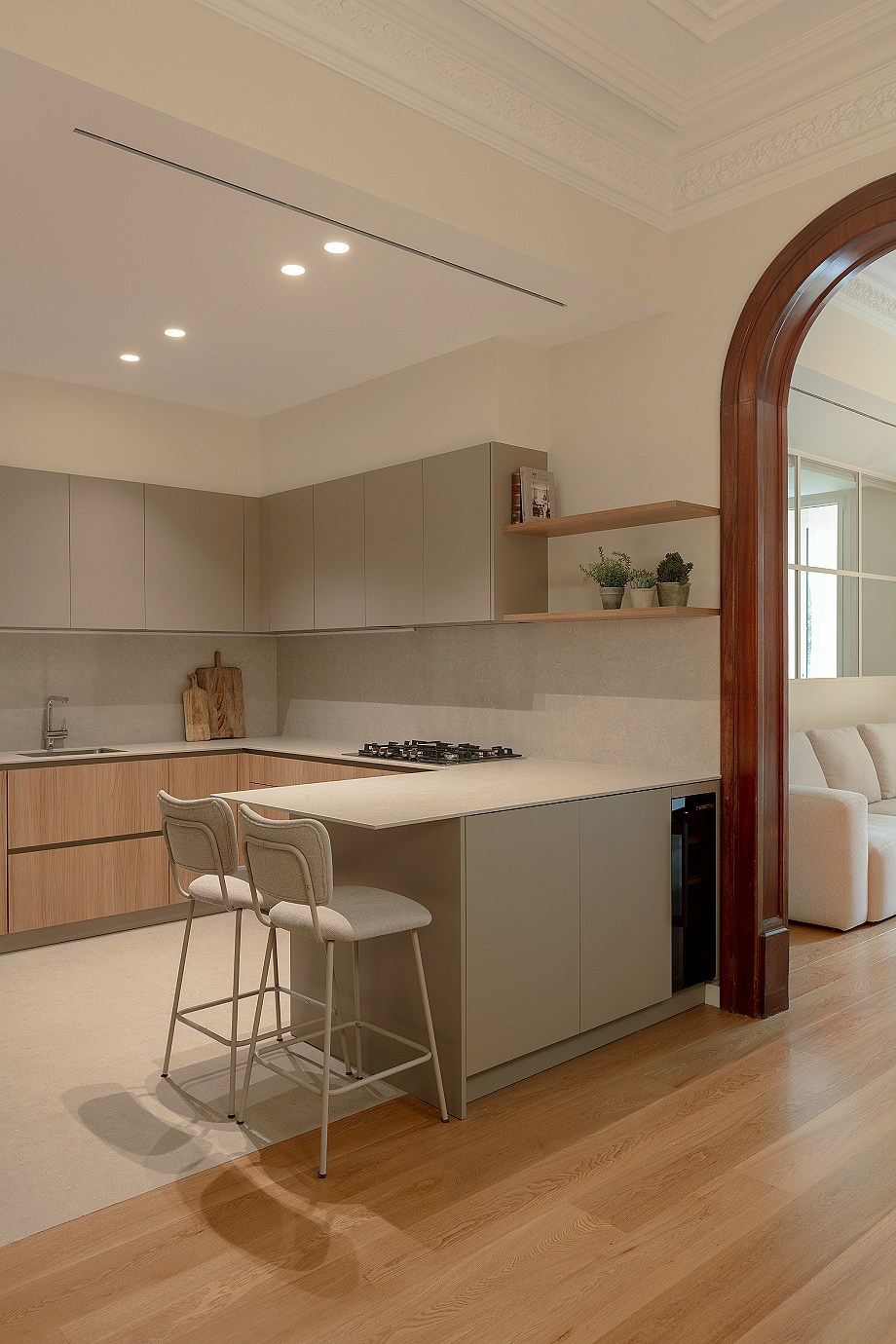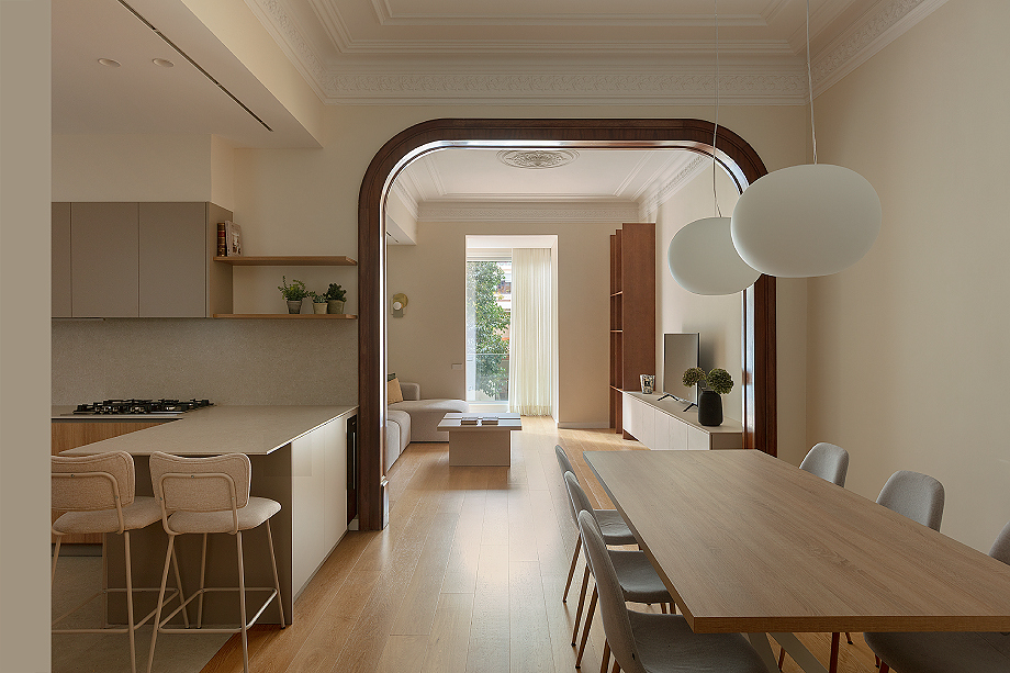 Los techos altos con molduras originales potencian la elegancia del piso y mantienen la esencia clásica de la arquitectura modernista del Eixample, combinándose con una distribución moderna que responde a la vida actual. Un rasgo característico de las viviendas de este distrito barcelonés, donde la arquitectura original convive con intervenciones contemporáneas que actualizan los espacios sin renunciar a su identidad.