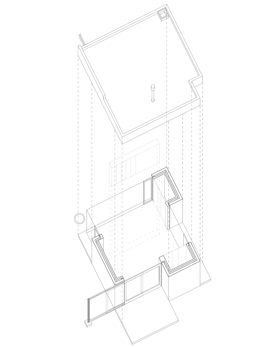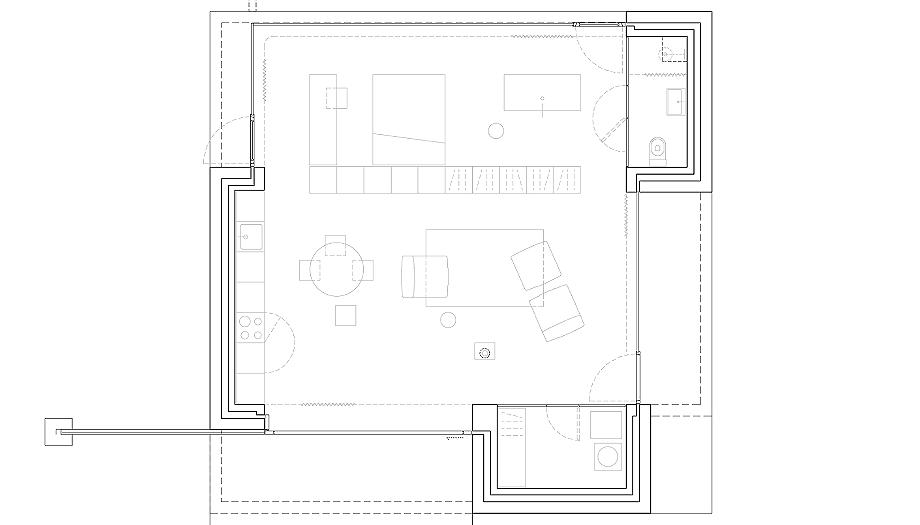 Este enfoque evoca el legado modernista de esta ciudad del noreste del país, situada cerca del río Mura, a la vez que lo traduce a un lenguaje espacial contemporáneo. La vivienda está articulada en torno a tres núcleos de hormigón armado que funcionan como estructura e infraestructura técnica, albergando el baño, los cuartos de servicio y la cocina. Estos núcleos sostienen una losa plana de hormigón, lo que permite que el espacio restante sea completamente abierto y flexible. Las áreas de estar y comedor se abren hacia el jardín y la terraza suroeste, mientras que los espacios para dormir y trabajar dan a un jardín noreste más íntimo. Un largo muro de almacenamiento de doble cara separa y conecta estas zonas sin romper la continuidad espacial.