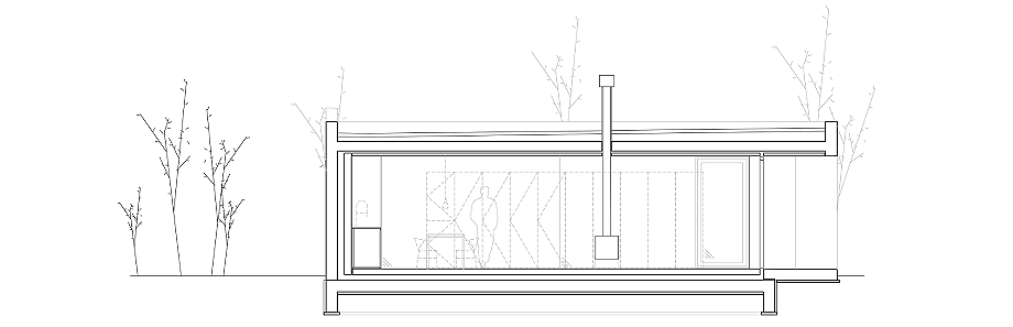 Este enfoque sobrio se mantiene en el interior, con suelos de hormigón pulido, muebles empotrados de aglomerado chapado, sillas reutilizadas y elementos de iluminación sencillos y de fabricación estándar. Una estufa compacta de hierro fundido da cohesión al espacio habitable en invierno, reforzando la atmósfera hogareña.