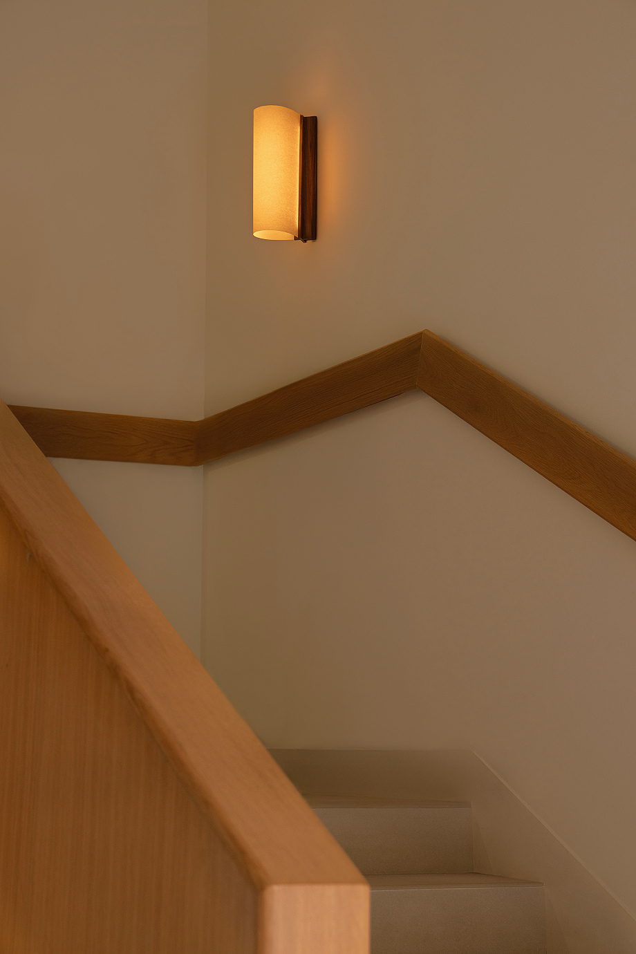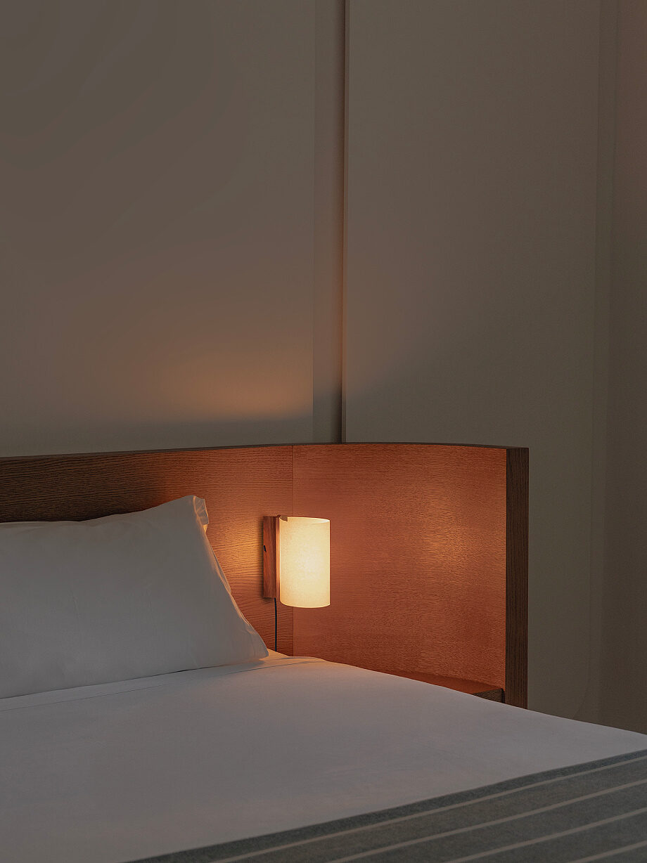 La versión de 18 cm actúa como un punto de luz preciso, especialmente adecuado junto a un cabecero o en zonas de paso, donde señala transiciones y construye una atmósfera íntima. Con 36 cm, la pieza adquiere mayor presencia y se convierte en un recurso de orden en el plano mural. Su repetición en serie introduce una secuencia vertical que aporta ritmo al espacio interior.