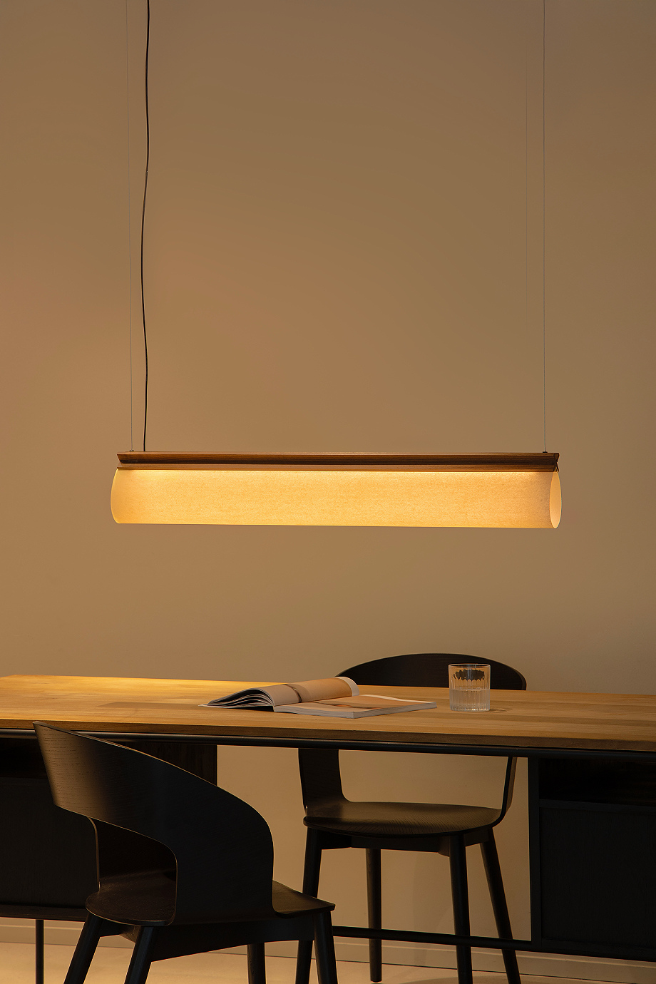 En su versión lineal suspendida, la pieza acentúa la dimensión horizontal y se concibe como un elemento sereno capaz de ordenar el espacio sin dividirlo. Dispuesta sobre una mesa, una isla o una zona de reunión, proyecta una línea continua de luz cálida que acompaña la arquitectura. Su volumen, ligero y casi etéreo, mantiene al mismo tiempo una presencia definida.