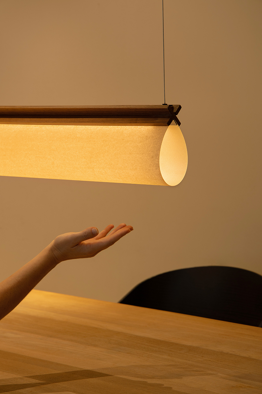 El diseño de Cata se origina en un simple gesto: una superficie de papel que, al curvarse y encontrarse con un soporte de madera, adquiere cuerpo y profundidad a través de un ajustado equilibrio formal. La madera -fresno en acabado nogal- actúa como soporte estructural y delimita la pieza, mientras que el papiro, ligero y envolvente, configura la atmósfera. De la interacción entre ambos materiales surge un objeto de carácter arquitectónico y presencia contenida, en el que la luz se integra con suavidad en el espacio sin imponerse.