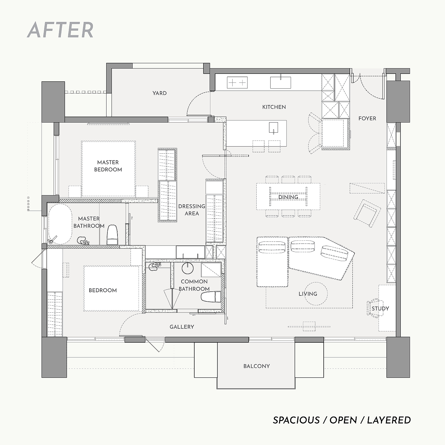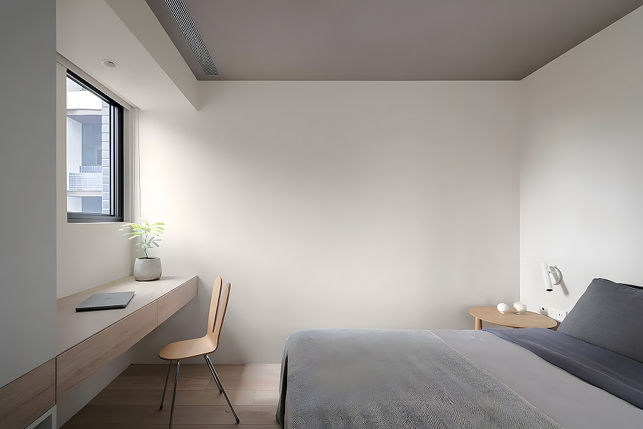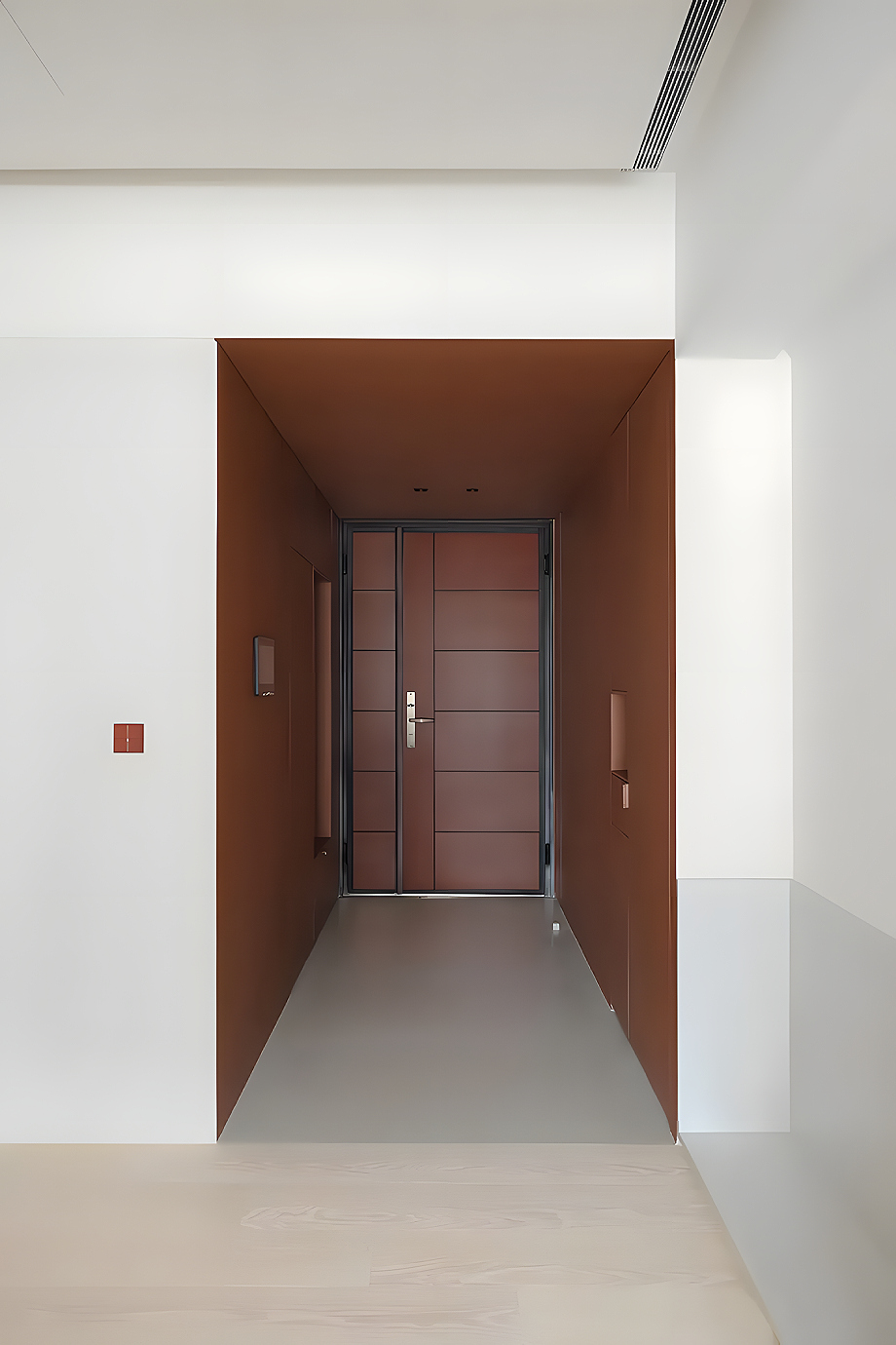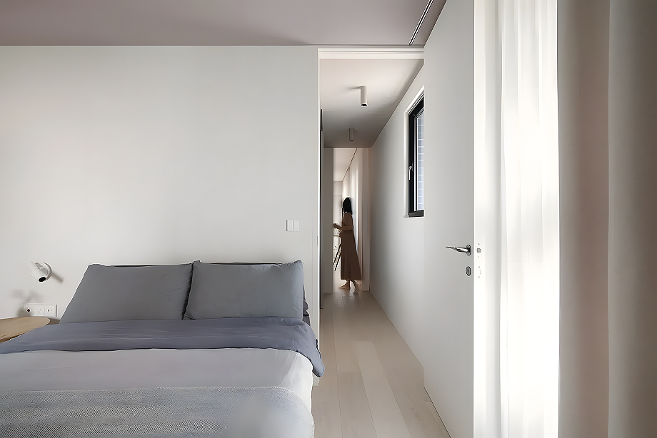 El espacio público se concibe como una planta abierta que integra cocina, comedor y sala de estar, orientada hacia la ventana para maximizar la entrada de luz natural, la ventilación y las vistas. En contraste, las zonas privadas se articulan a través de sutiles giros espaciales que generan una progresiva sensación de intimidad, como si «se estuviera en una cueva primigenia por la noche”, apuntan los arquitectos. Los dormitorios se reubican en función de las rutinas diarias: el dormitorio secundario se orienta al sur para captar la luz matinal, mientras que el dormitorio principal se abre hacia el oeste, en dirección a un patio interior más tranquilo.