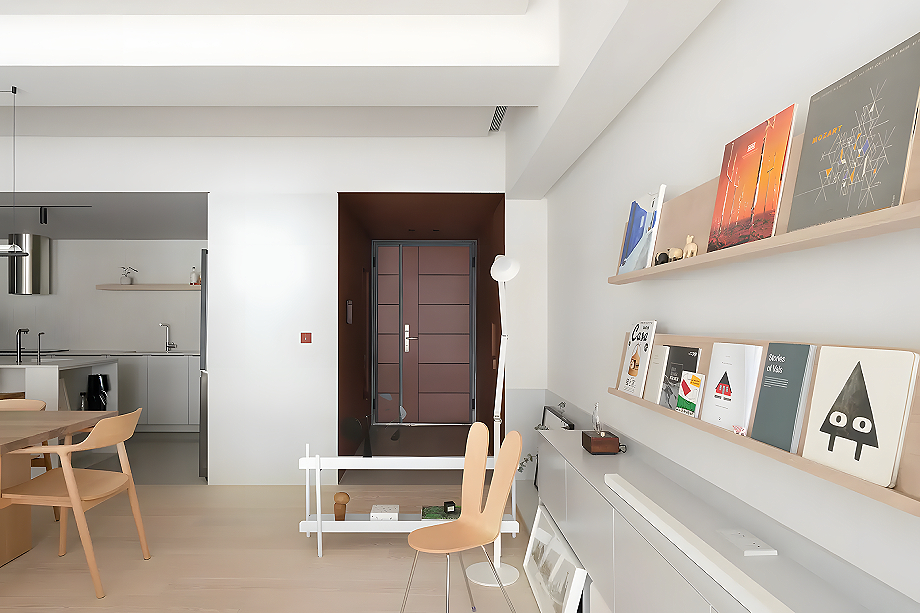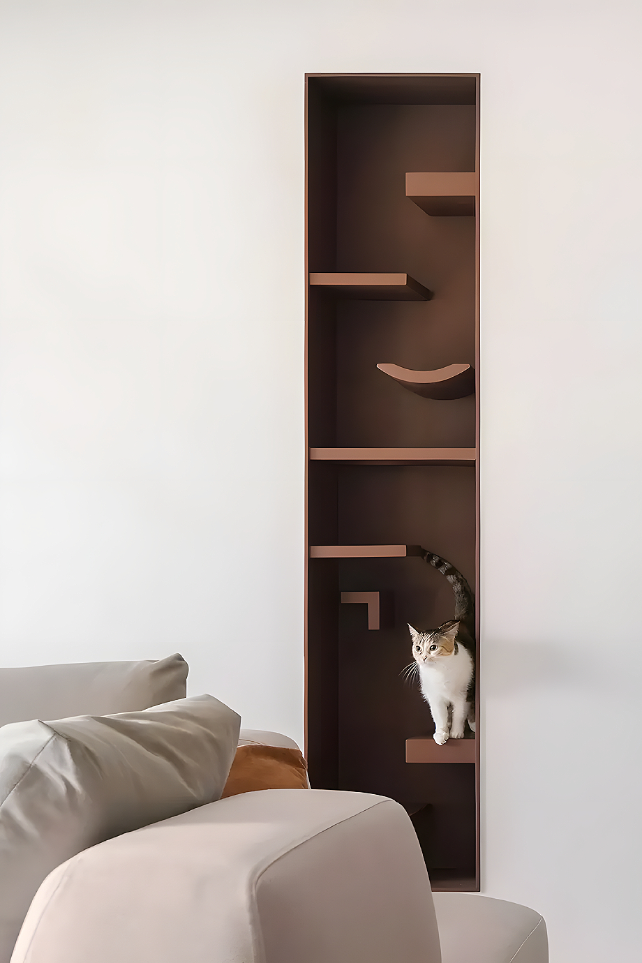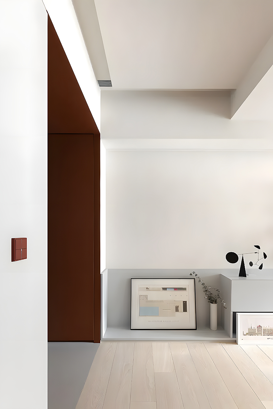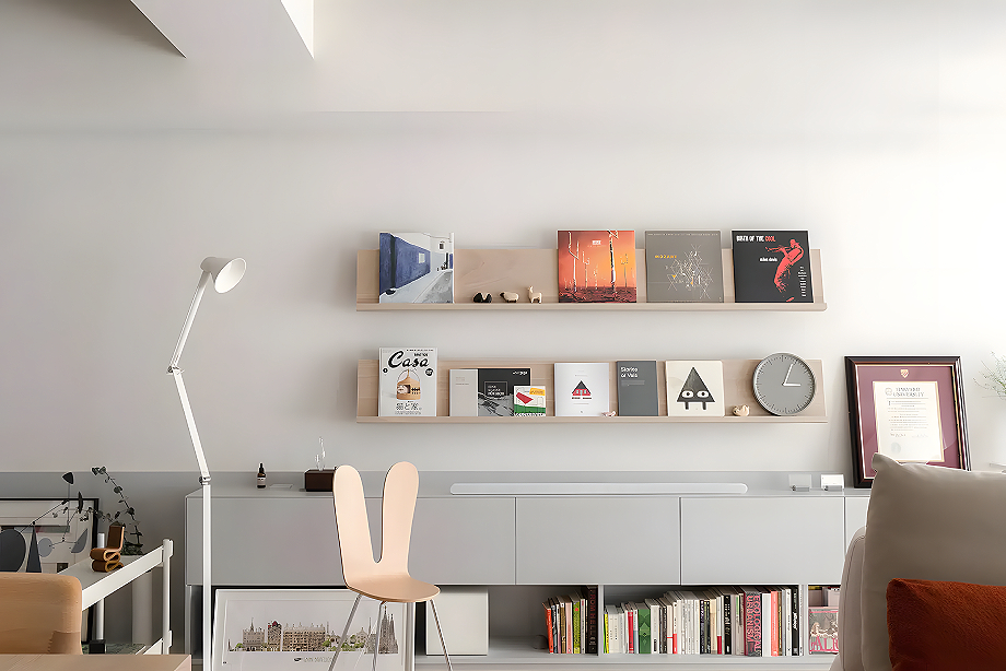 En un reflejo de la filosofía de diseño del estudio, el proyecto evita la ornamentación innecesaria y apuesta por la claridad espacial y las líneas depuradas, generando un entorno flexible para la vida cotidiana. Por ejemplo, la pared principal del salón incorpora un mueble bajo con estanterías, mientras que otra pared integra un elemento expositivo que, a su vez, funciona como estructura lúdica para el gato de la familia, combinando vitrina y rascador, y permitiendo que el espacio evolucione con sus habitantes.