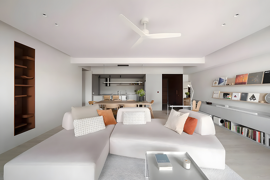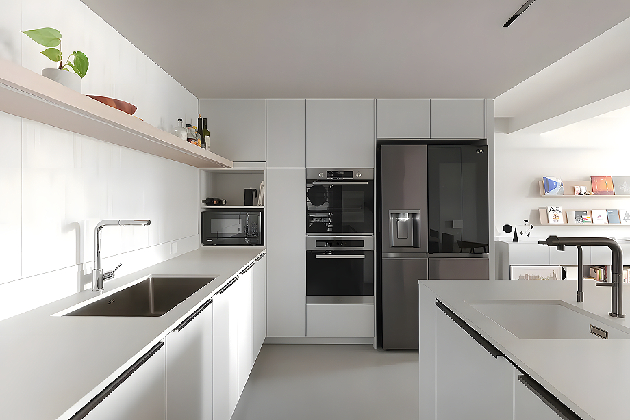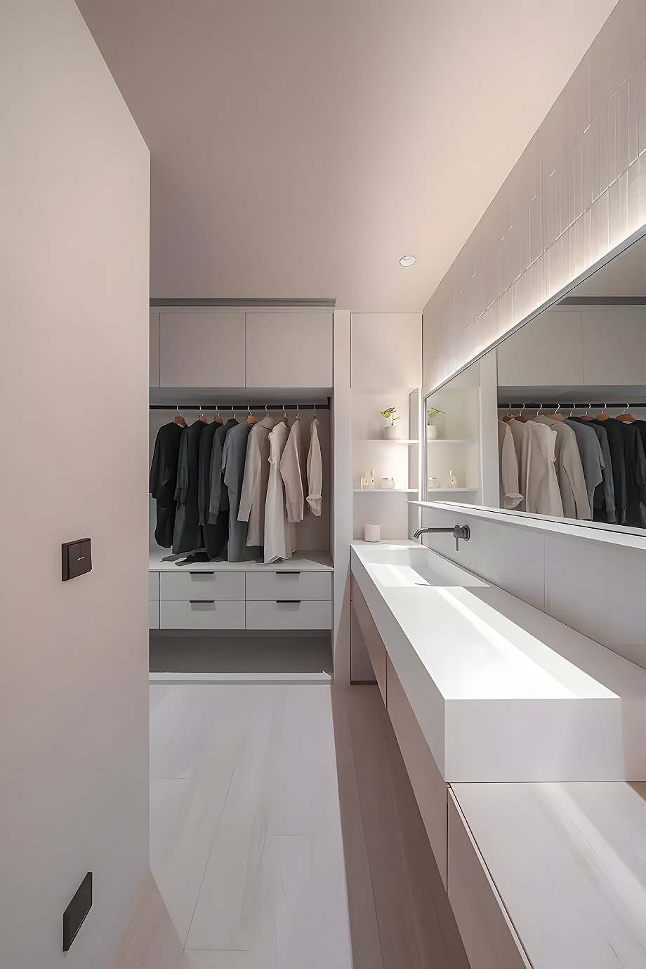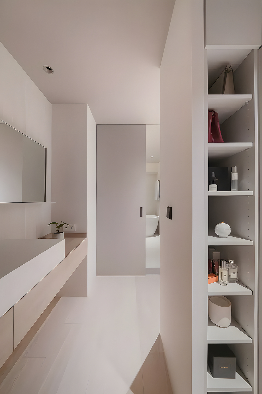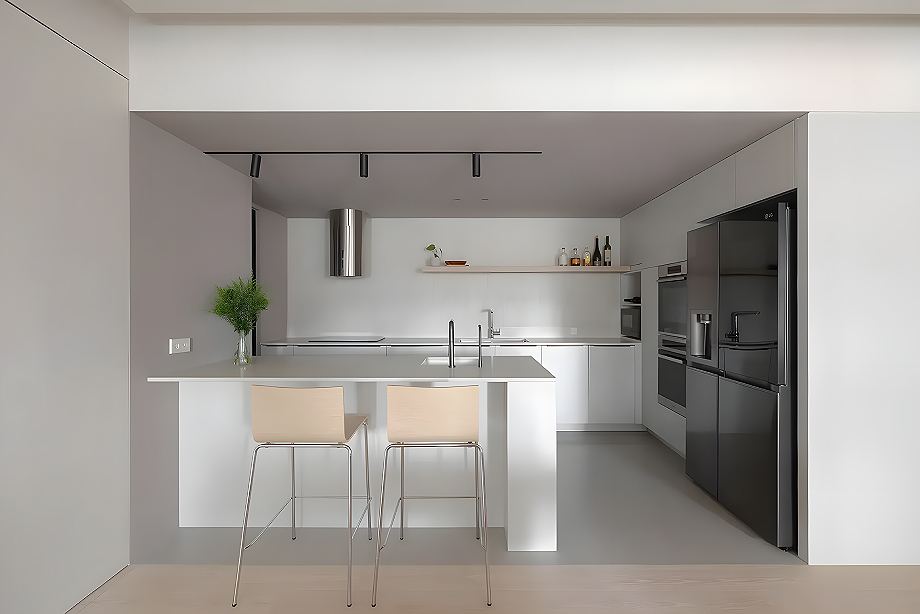 En un reflejo de la filosofía de diseño del estudio, el proyecto evita la ornamentación innecesaria y apuesta por la claridad espacial y las líneas depuradas, generando un entorno flexible para la vida cotidiana. Por ejemplo, la pared principal del salón incorpora un mueble bajo con estanterías, mientras que otra pared integra un elemento expositivo que, a su vez, funciona como estructura lúdica para el gato de la familia, combinando vitrina y rascador, y permitiendo que el espacio evolucione con sus habitantes.