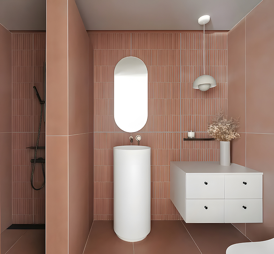 La paleta cromática, que recurre al avena, el gris, el café con leche y el terracota, se inspira en tonos terrosos que se hacen eco de la fachada del edificio. Las tonalidades más claras se utilizan como base en las superficies de mayor extensión, mientras que los tonos más oscuros se reservan para generar acentos y definir ambientes clave.