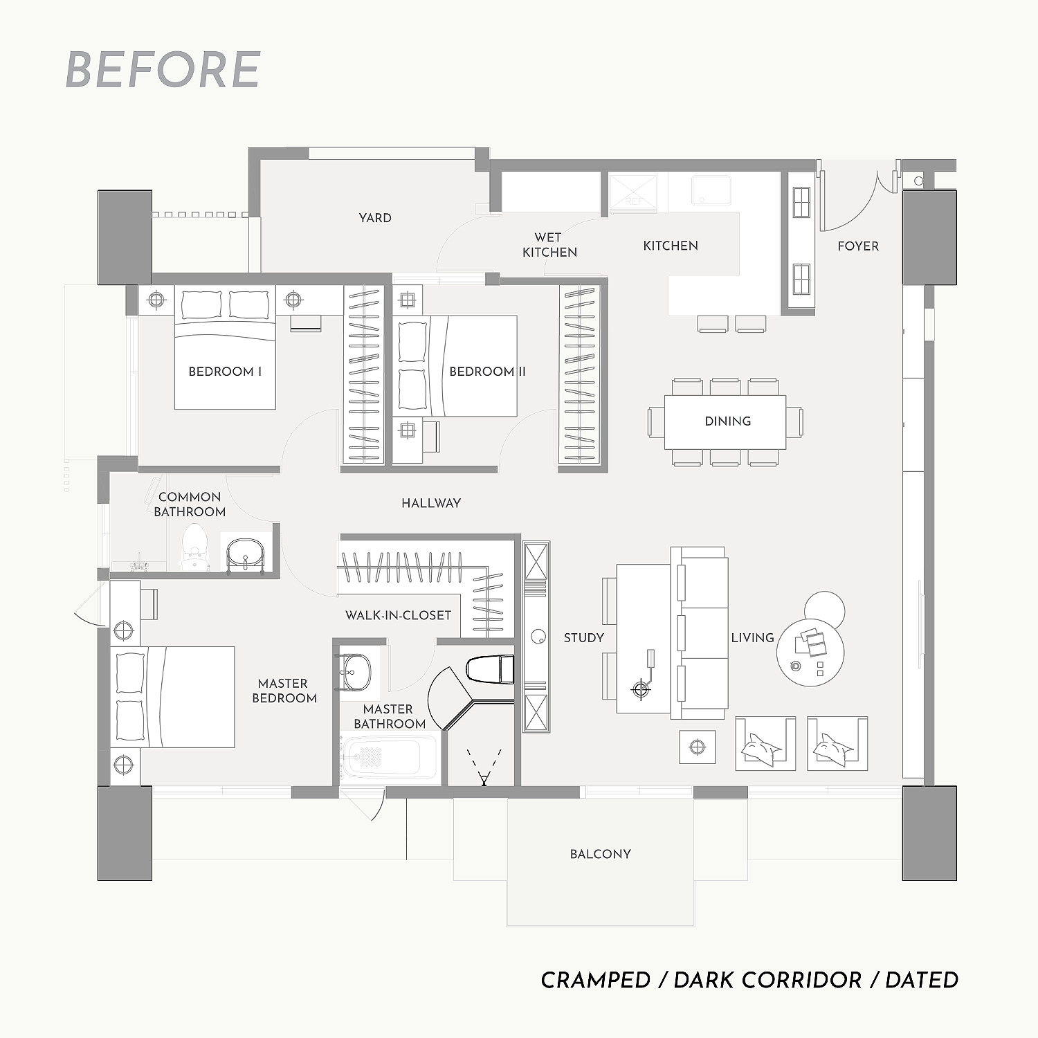 El proyecto responde a la voluntad de no solo crear espacios estéticamente cuidados, sino también de incrementar su valor funcional. A través de ajustes en la distribución general, se eliminaron los espacios fragmentados y desconectados del estado original, garantizando una correcta iluminación natural y ventilación en toda la vivienda. Ahora, la casa se organiza a través de un eje central que distingue con claridad las zonas públicas de las privadas.