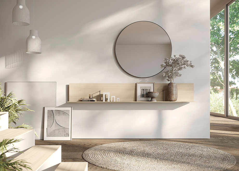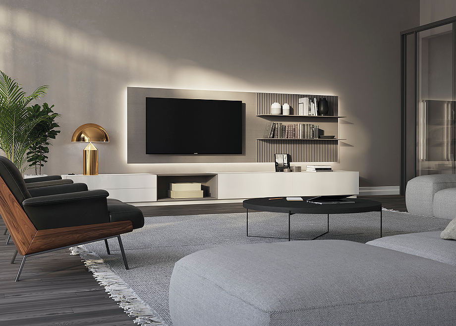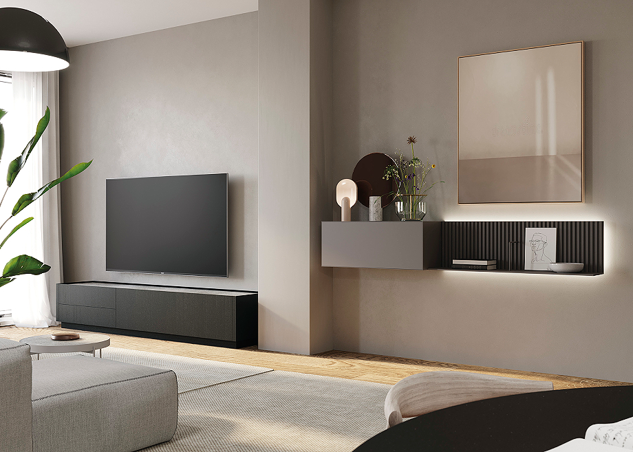 ART está disponible con tres tipos de acabado frontal: liso, alistonado o combinado. A esta variedad se suma la posibilidad de incorporar iluminación LED perimetral, que refuerza su presencia y permite enriquecer la lectura del conjunto en el espacio. El sistema se ofrece además en diferentes materiales y acabados, incluyendo chapa de madera, chapa sintética y lacados, ampliando así su capacidad de integración en múltiples escenarios domésticos. Desde composiciones para zonas de estar que combinan almacenamiento y equipamiento audiovisual, hasta soluciones destinadas a áreas de trabajo en el hogar, donde la organización y la funcionalidad se articulan de manera equilibrada.