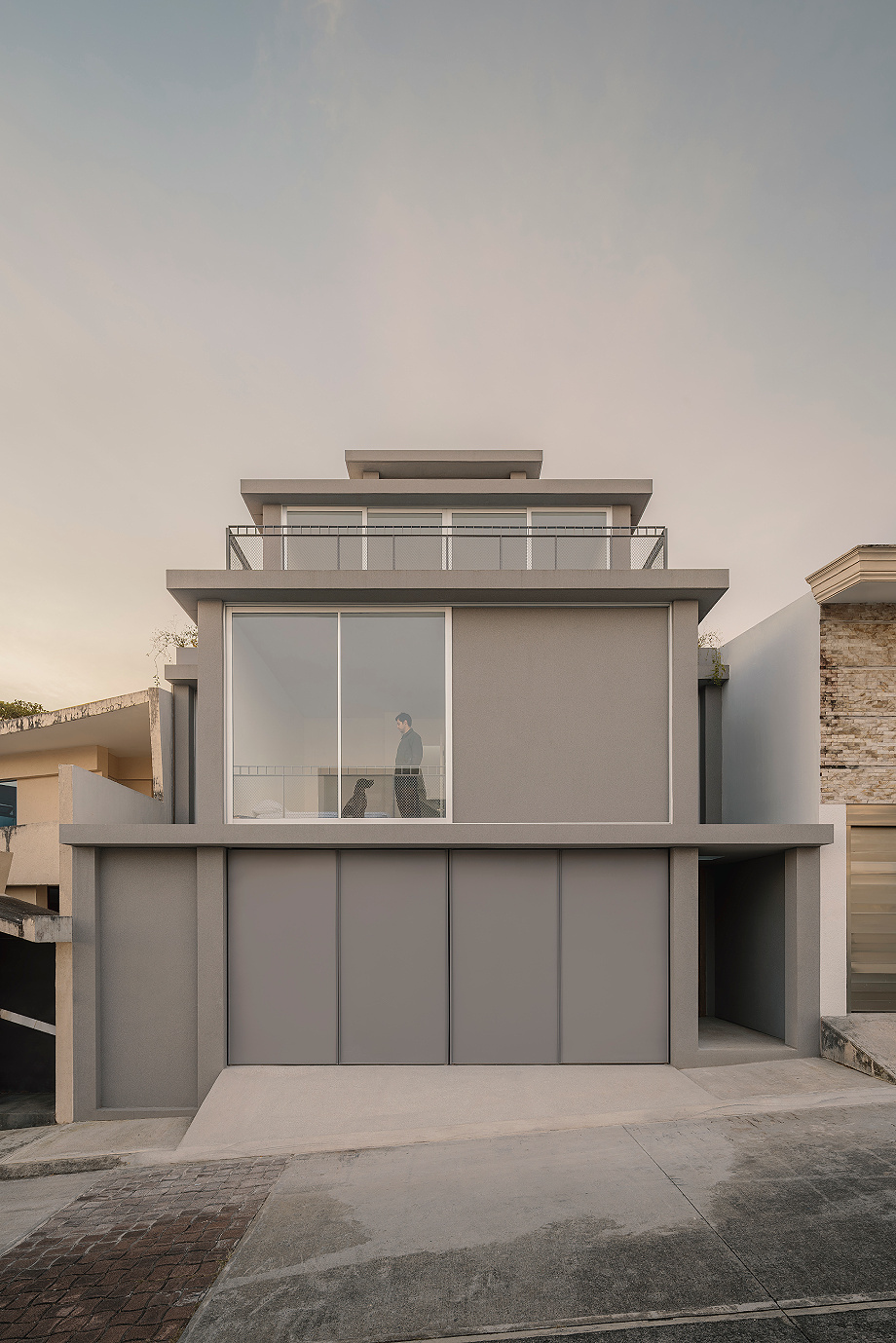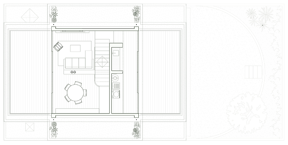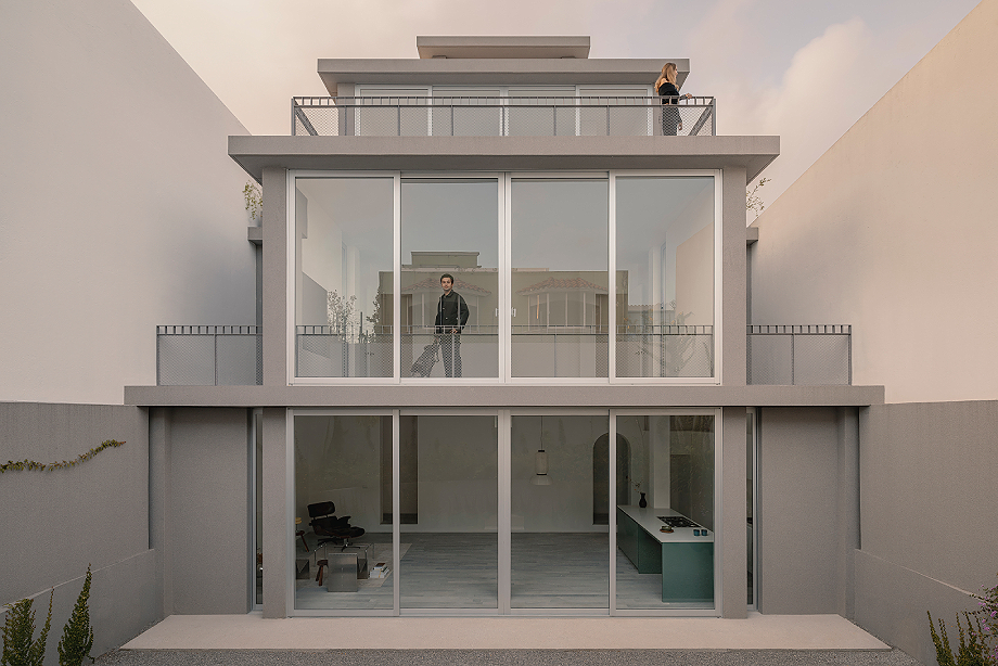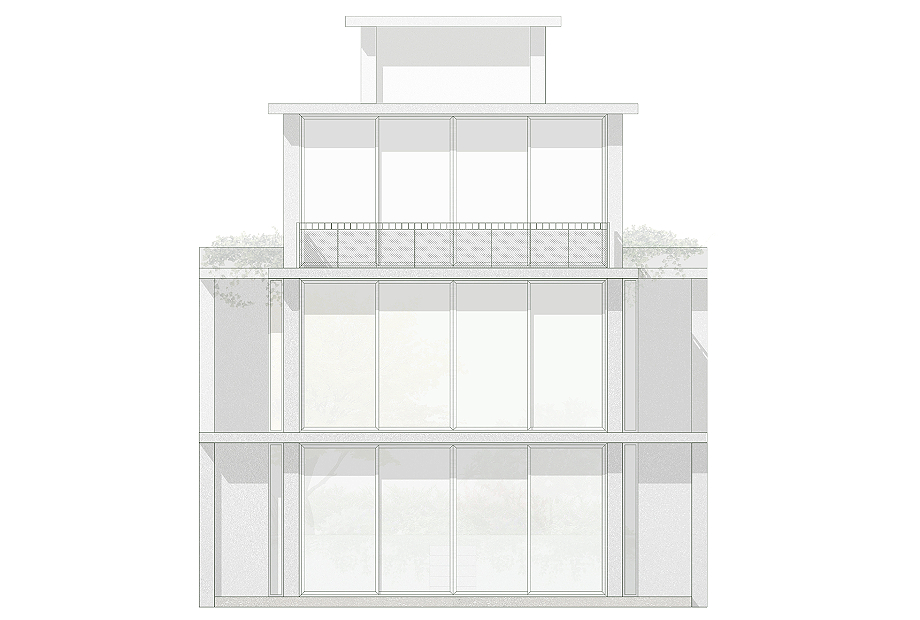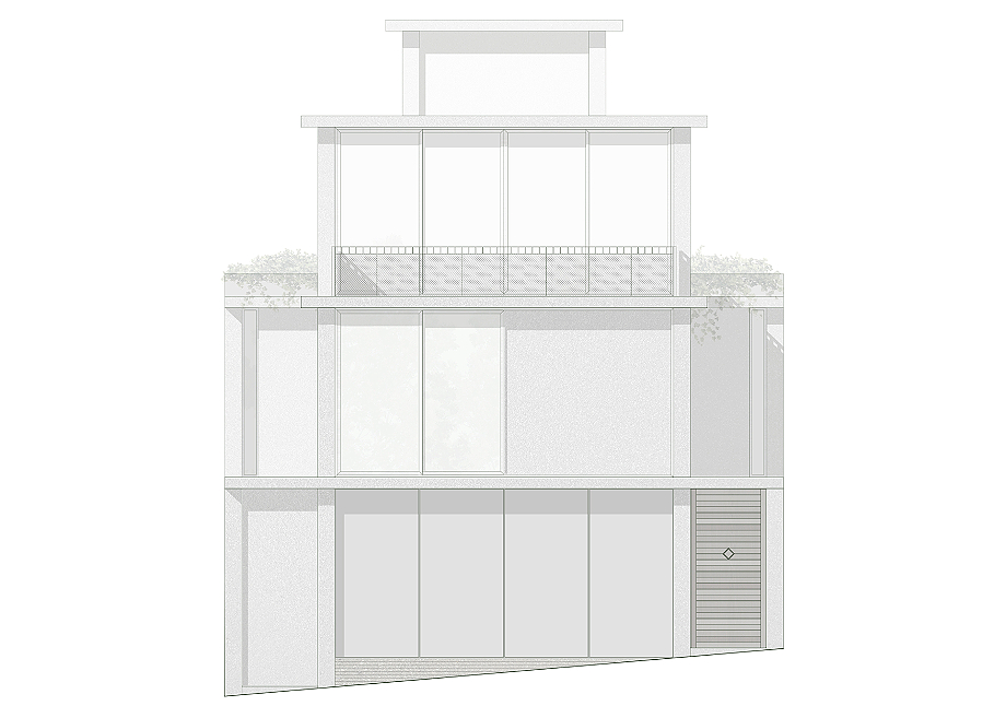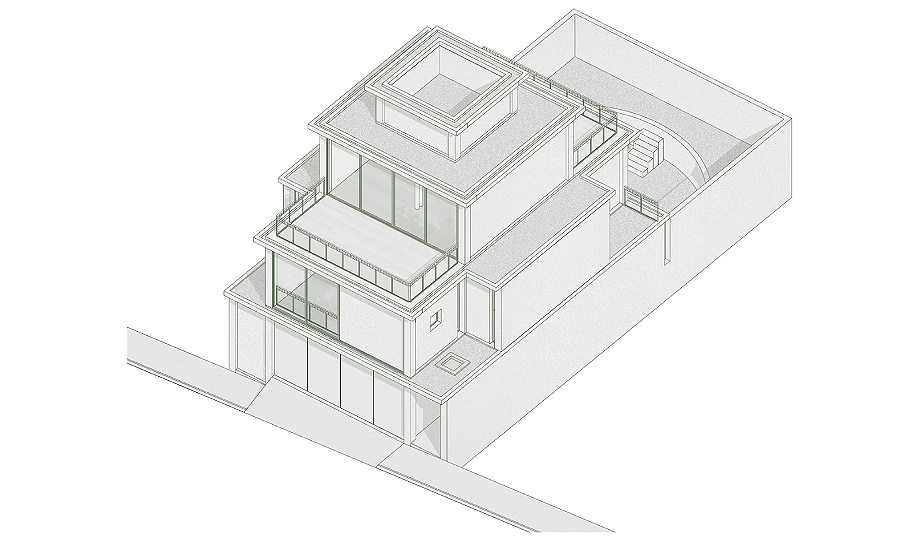 En lo más alto, un volumen de servicio remata el conjunto sin artificios. De lenguaje directo y sobrio, alberga los sistemas que hacen posible el funcionamiento de la vivienda. Lejos de ocultarse, este cuerpo se muestra con claridad y cierra la composición, subrayando una idea precisa: incluso los elementos más prácticos pueden formar parte de la expresión arquitectónica con plena legitimidad.