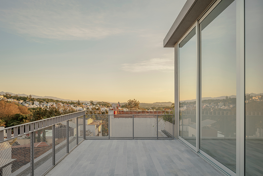 El siguiente nivel se repliega respecto al perímetro inferior, marcando una transición más íntima. La sala y el estudio se integran en un único espacio continuo, bañado por la luz cálida del atardecer que define la atmósfera del conjunto. Hacia el exterior, amplias terrazas -ya por encima de las edificaciones vecinas- prolongan la experiencia habitable y abren las vistas hacia el paisaje. Desde aquí, el entorno natural, con su vegetación abundante, se percibe como una escena de postal que acompaña la vida cotidiana.