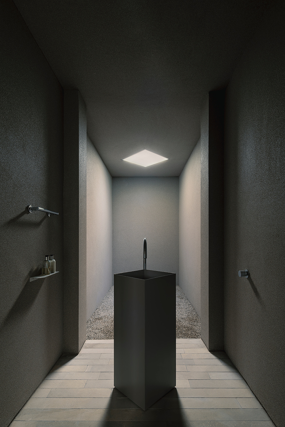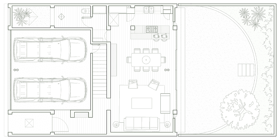 En términos de uso, la planta baja se concibe como el núcleo de la vida en común. Los espacios se enlazan de manera fluida pero controlada, abrazados por un semicírculo de grava que envuelve un árbol: un guayacán, cuya floración introduce una dimensión estacional y casi sensorial al conjunto. Al fondo, sumido en una penumbra deliberada, aparece un lavabo de metal tratado como una pieza autónoma, casi escultórica. En este punto, el agua deja de ser un recurso meramente utilitario para convertirse en una experiencia integrada en el recorrido doméstico, con un carácter cercano a lo ceremonial.