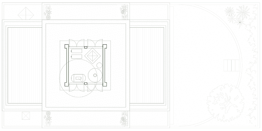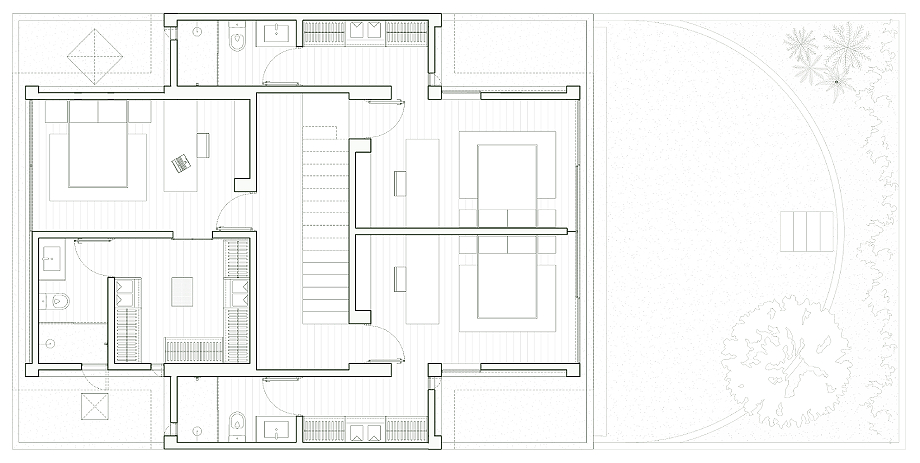 En el primer piso, la vivienda se organiza a partir de una geometría en cruz que estructura el espacio con precisión. Tres estancias se disponen alrededor del eje vertical, manteniendo un equilibrio claro en su distribución: al frente, la habitación principal se abre hacia la ciudad, mientras que las secundarias se extienden hacia los laterales, vinculándose de forma más directa con el jardín.