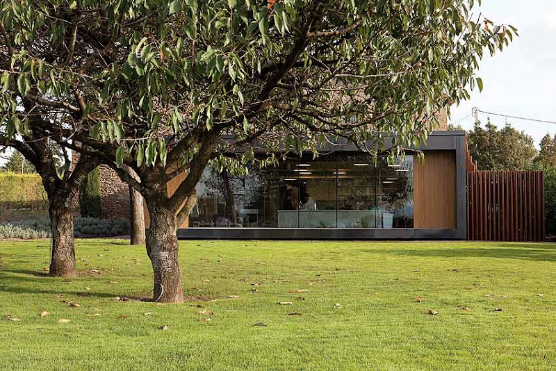 Dos atrayentes puntos de la intervención son los nuevos volúmenes anexados a la casa, que se presentan en cajas de hierro. Uno de ellos es la cocina y se adelanta a la fachada principal con un gran ventanal que deja ver todos los preparativos y el trabajo que los cocineros realizan en su interior.